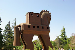 Troja,- šis pavadinimas mums žinomas iš mokyklos laikų, jį yra girdėję visi. Dabar tai muziejus po atviru dangumi. Prie įėjimo stovi didžiulis medinis arklys. Skubame į jį įlįsti ir nusifotografuoti. Troją kasinėjo vokietis Šlimanas. Atkastos 9 skirtingų laikų civilizacijos liekanos. Gyventa čia daugiau nei 4000 metų laikotarpyje. Čia vyko Homero “Iliados” veiksmas, čia vyko Trojos karas. Nuo tada “Trojos arklys” reiškia išdavystę.