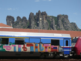 Kai kuriose iš jų viršūnių įsikūrę vienuoliai. Vienuolynai vadinasi Meteorai-( Sklandantys ore ). Vienuolynus pradėjo statyti XIV amžiuje. Baigti statyti XVI amžiuje. Yra 6 vienuolynai.