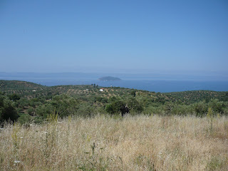 Važiuojame į pietus. Matyti minėta sala, toliau Kasandros pusiasalis, daug įlankų ir paplūdimių. Šioje “piršto” pusėje daug vynuogynų.