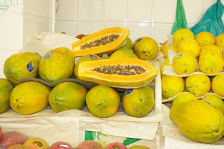Taip pat turguje dideli papajų vaisiai. Lauro lapai fasuoti ir sveriami.