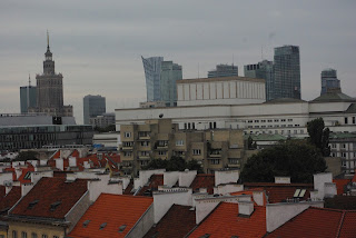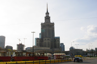 Iš toli matomi kultūros ir mokslo rūmai. 230 metrų aukščio, 42 aukštų pastatas, L.Rudniev projektuotas milžinas. Anksčiau atrodęs kaip svetimkūnis Varšuvoje, jis tampa patrauklesnis. Į jį veda ekskursijas. Vakarais apšviestas man visai patiko. Ir net į objektyvą tilpo.