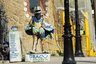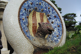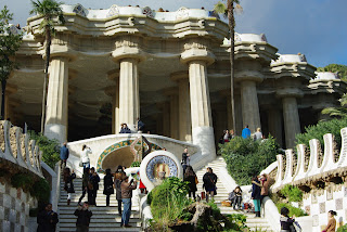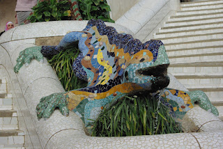 Įeinant į Giuelio parką, stovi 2 A. Gaudi projektuoti paviljonai. Viename jų pardavinėjami suvenyrai, kitame supažindinama su A.Gaudi gyvenimu ir kūryba. Šalia geriame gardžią espresso kavą. Turiu pastebėti, jog kava Barselonoje labai skani, stiproka ir gana nebrangi. Prie vartų aktorius vaidina drakoną, vilioja turistus.