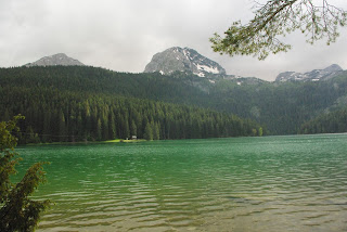 Man jo spalva visai ne juoda. Vanduo šaltas, mažiau +10. Aplink spygliuočiai. Tai Durmitoro Nacionalinis parkas, saugomas UNESCO. Už ežero matyti snieguotos kalnų viršūnės virš 2000 m. Jos atsispindi ežere.