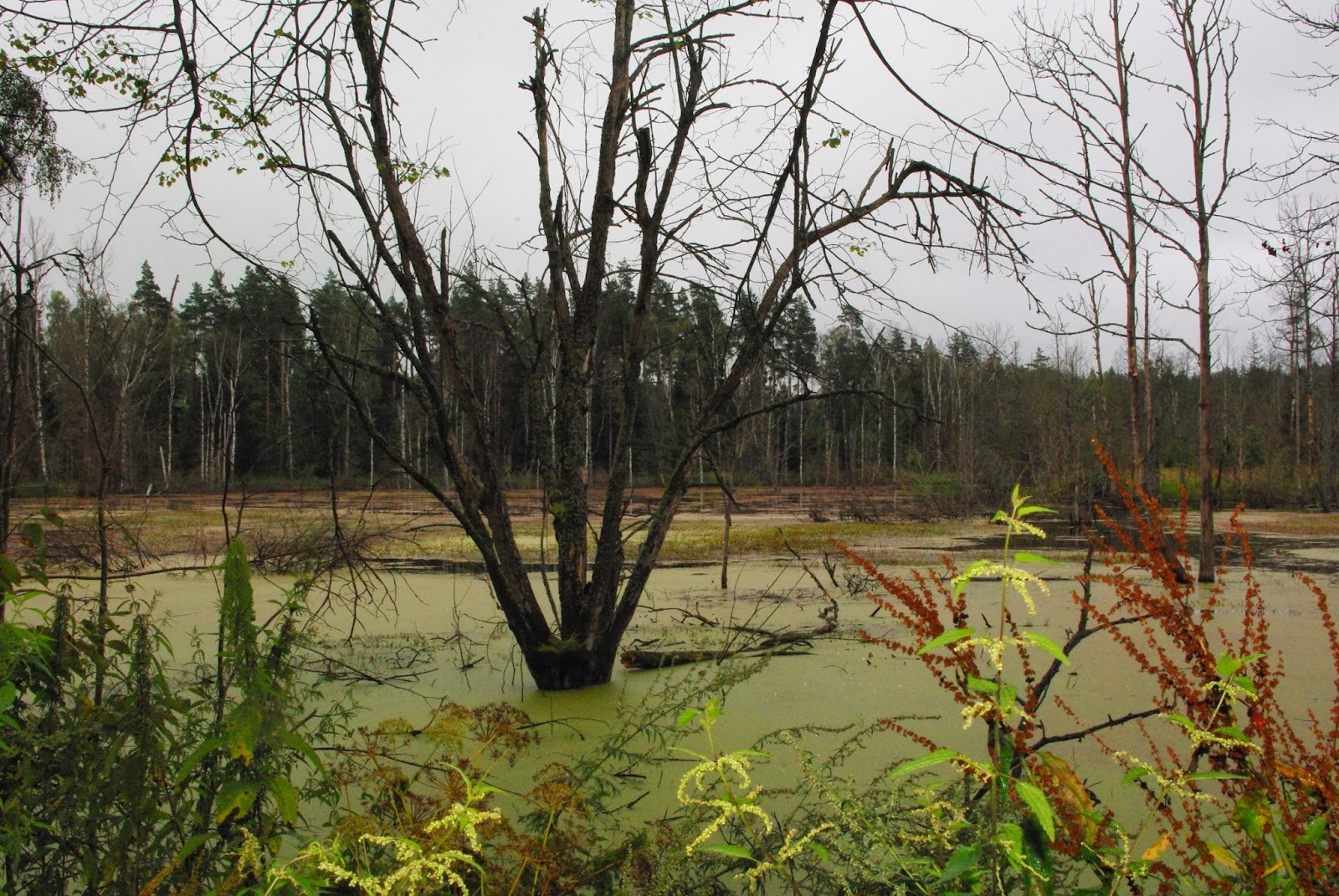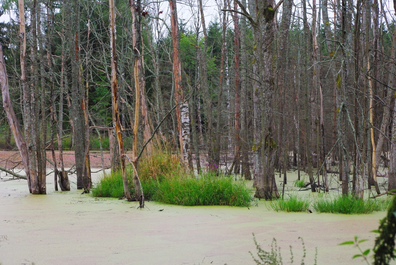 Už kaimo tuoj miškas. Šlapias ir nemalonus. Kilometrą pavažiavus, pasiekiu keistą vietą. Kairėje medžiai auga iš vandens. Sutrikusi hidrocirkuliacija. Nemaža reto miško dalis po vandeniu prie pat kelio. Vanduo stovintis ir pažaliavęs. Jei važiuočiau kairiau, o už miško dešiniau, pasiekčiau garsiuosius Stančikų viadukus. Atstumas nedidelis , bet kelias prastas ir šlapias. Čia važinėja tik gamtos mėgėjai.