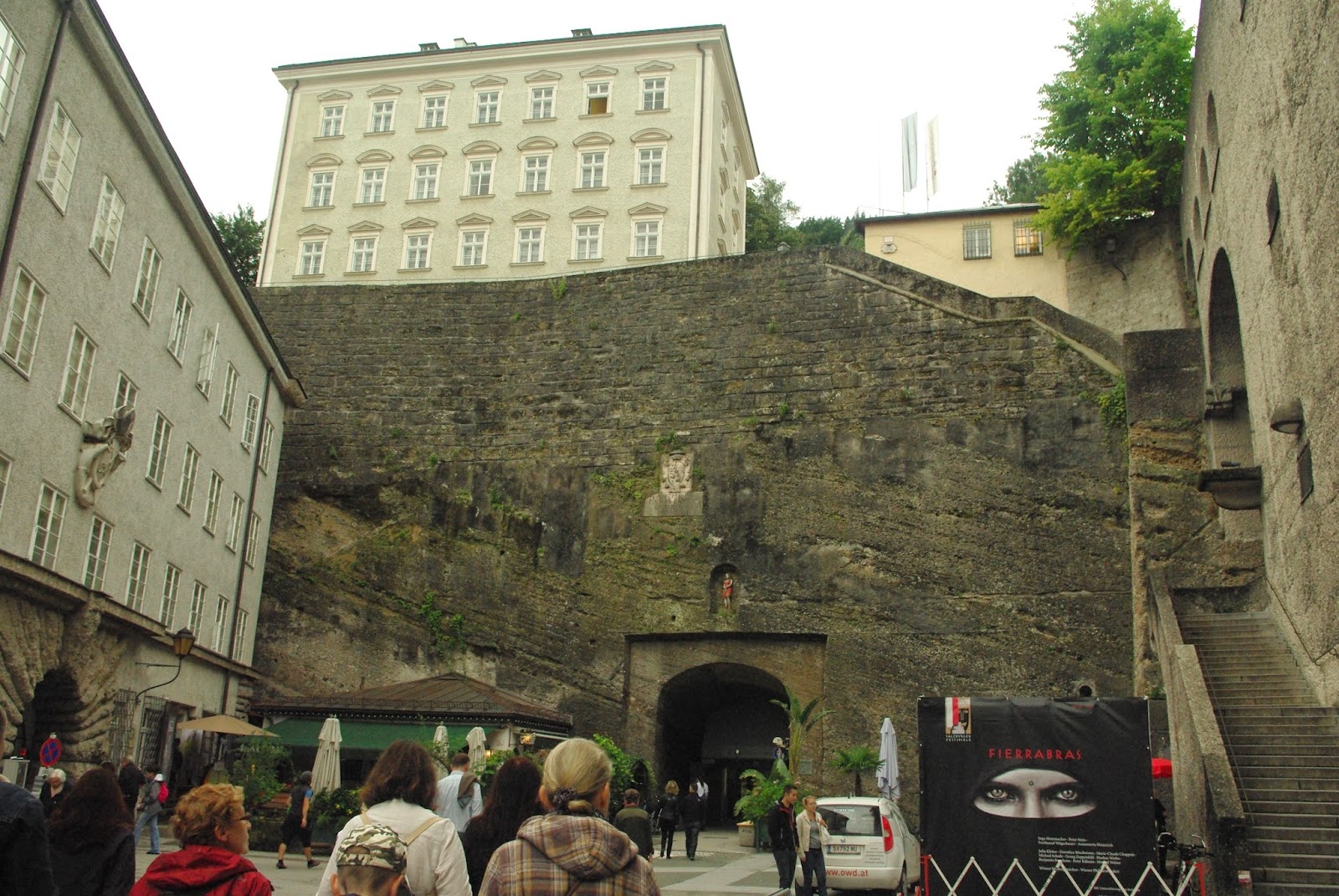 Iš čia pėsčiųjų tiltu, apkabinėtu įsimylėjėlių spynomis, pasiekiame Zalcburgo senamiestį. Čia katedra. Ant kalno stovi Zalcburgo tvirtovė. Užvažiavau funikulieriumi.
