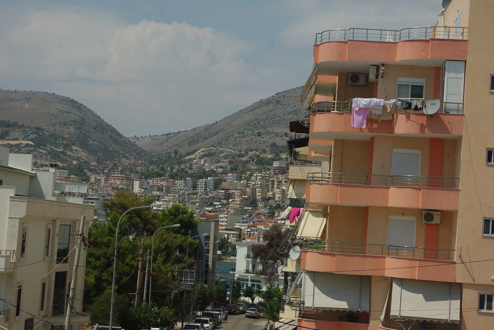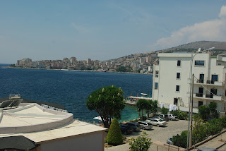 Teko valgyti Sarandos centre ant restorano plokščio stogo. Maistas skanus. Primena graikišką virtuvę. Pasižiūri žemyn nuo stogo- magistralinė gatvė, važiuoja mašinos, pasižiūri tolyn- matai kalnus virš miesto ir paplūdimį žemiau Sarandos. Kalvų viršūnės virš Sarandos rusvos spalvos, turi mažai augmenijos.