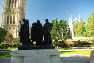 Už rūmų stovi Rodeno skulptūra “Kale piliečiai”. Plaukiau iš Kale, todėl norėjau pamatyti. Rodeno kūryba man patinka. Istorija tokia: viduramžiais anglai išvarė 6 žmones iš Kale miesto, atėmė miesto raktus. Jie eina ratu, sukasi ir niekur nenueina. Amžinos problemos. Po šimtų metų skulptūra labai tinkanti ir dar… prie JK Parlamento. Nors anglai buvo kalti dėl kaliečių tragedijos, nebijojo pastatyti skulptūrą šalia.