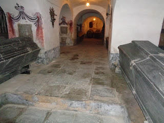 Sarkofagai yra už metalinių grotų ir prieblandoje. Vienas sarkofagas yra pilvotas, nes mirusi nėščia giminės atstovė. Vienas yra prie laiptų, jį galima pačiupinėti. Iš viršaus yra metalinis sarkofagas, viduje medinis karstas. Jo viduje nieko nėra.
