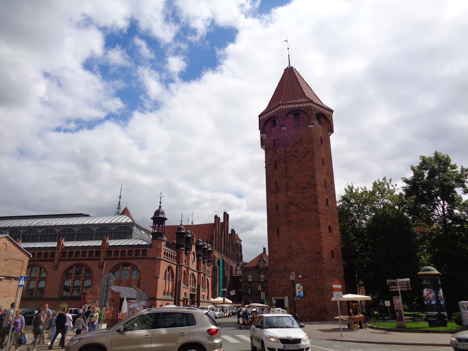 Netoliese yra turgaus paviljonas, gražus raudonas. Bet tokių gražių pastatų Gdanske daug. Šalia stovi raudonas bokštas, pastatytas 1400 metais. Jis turi keletą pavadinimų. Pats geriausias “Kiek in de kiok”. Lietuviškai tai būtų: “Žiūrėk į virtuvę”. Kas buvo Taline, ten yra tokiu pat pavadinimu bokštas.