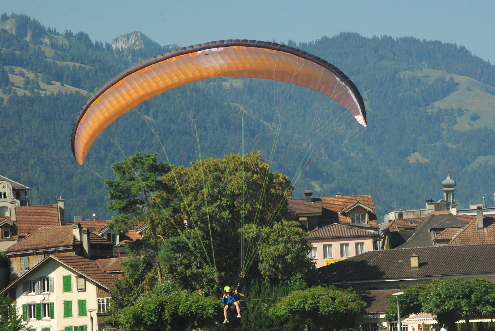 Netoliese aplankome Interlakeną- kurortą, įsikūrusį tarp Tuno ir Brienz ežerų. Čia lygumoje įsikūręs miestas. Aplink kalnai. Slėnyje pučia pastovūs vėjai. Juos išnaudoja parasparnininkai. Jie leidžiasi nuo aplinkinių uolų į miesto centrą.