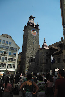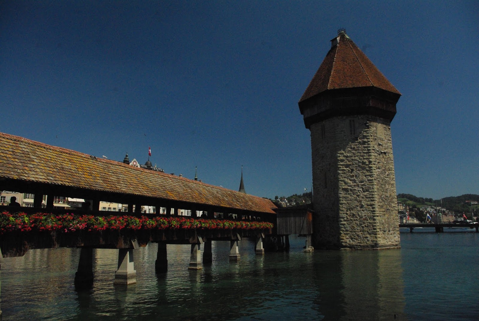 Priplaukėme Liucerną. Šveicarijos centras. Miesto vizitinė kortelė- dengtas medinis koplyčios tiltas su bokštu. Aštuonkampis Vandens bokštas buvo archyvas, iždas ir kalėjimas, pastatytas 1300 metais.