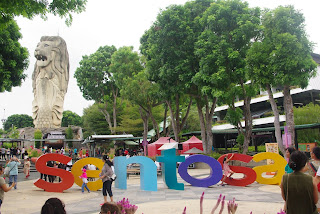 Vaikščiojom po Santosą, priėjom tiltą, perėjom jį ir patekom į kitą salelę. Ten yra piečiausias Azijos žemyninės dalies taškas. Mes jame buvome. Iki čia galima atvykti žeme. Singapūro sala su Malaizija sujungta 2 tiltais. Santosa su Singapūru sujungta dideliu tiltu, galima atvykti automobiliu. Mes rinkomės turistiškesnį lyno kelią.