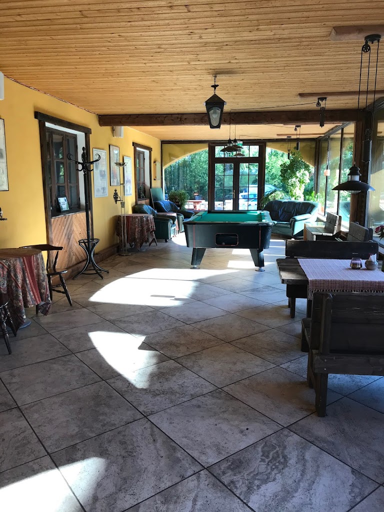 Restauruotas senas pastatas prašmatnus, skanus maistas. Aplinka graži, žydi gėlės. Pavėsinėje stovi mediniai karžygiai.