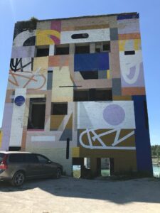 Dauguma nardytojų- lietuviai. 3 pastatai išlindę iš vandens. Prie jų priplaukia poilsiautojai, užsikabaroja ir šoka į vandenį. Šalia vandens plati teritorija deginimuisi.