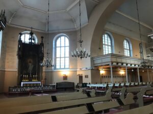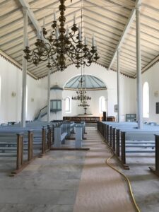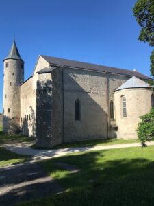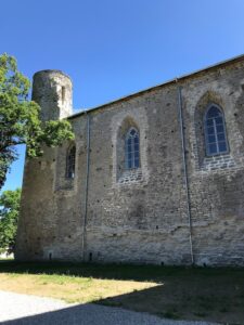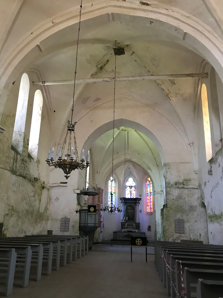 Aplankėme bažnyčią. Jos puošyba kukli, remontuojama. Krikštykla išlaikiusi romaninį stilių. Manoma, kad ji to paties meistro kaip Rygoje. Šventoriuje užaugę didžiuliai grybai.