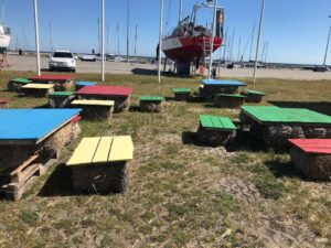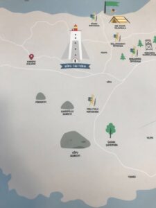Kelte staliukai su salų žemėlapio dalimis. Apėjus visus staliukus, susidarai bendrą vaizdą. Iš Syru Hiumoje į Trigi Saremoje 17 km nuplaukiame per 1 valandą. Štai mes Saremoje.