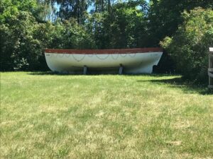 Ant pakylos iškelti atitarnavę laivai. Į keltą pakliuvome “per Marytės plauką”- paskutiniai. Gražiai nuo viršaus matosi automobilis gale su kelto “ariama” vaga sąsiaurio vandenyje.