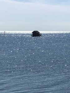 Matosi 2 švyturiai. Stovime gyvoje eilėje į keltą Saremon. Labai karšta. Saulė svilina. Jūra šalia, bet nerimas dėl patekimo į keltą. Jūroje matosi namukas.