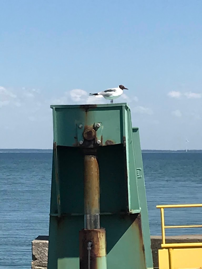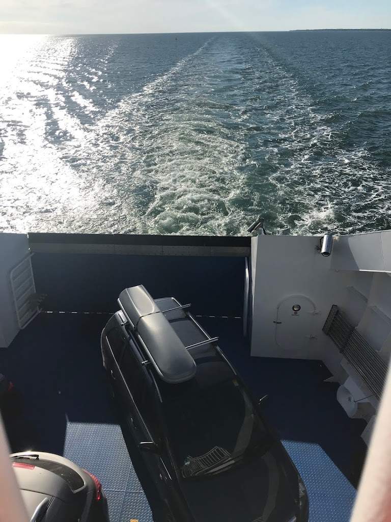 Netoli miesto Rohukula uostas iš kur plaukia keltai į Vormsi ir Hiumos salas. Pasirinkome pastarąją. Plaukiama 75 minutes. Keltas labai modernus ir komfortabilus. Visi telpa. Iš paskos skrenda žuvėdros.