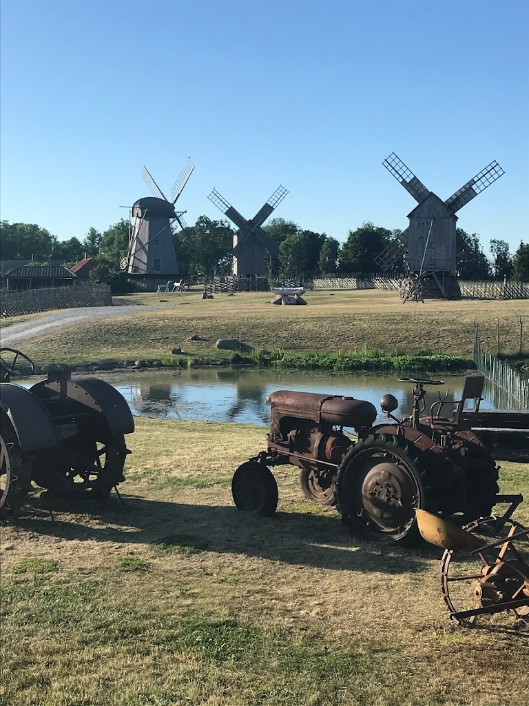 Senų traktorių ir žemės ūkio padargų ekspozicija. Smagu vaikščioti aplink malūnus, jie gerai apšviesti saulės, lengva fotografuoti.