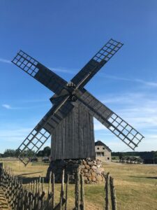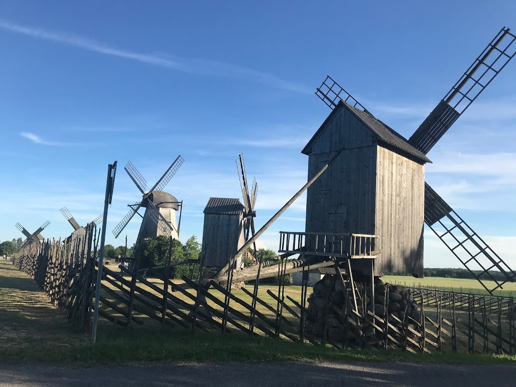Važiuojame į Angla kaimą. Čia stovi 5 malūnai. Tai turistinis objektas. Vienas malūnas mala grūdus vėjo pagalba. Kultūros paveldo centre vyksta duonos kepimo edukacijos.