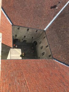 Bažnyčia skersai gatvę. Jos vidus L raidės formos. Mūsų namas kaip priestatas XVII amžiaus namo, matomai seniausio mieste.