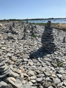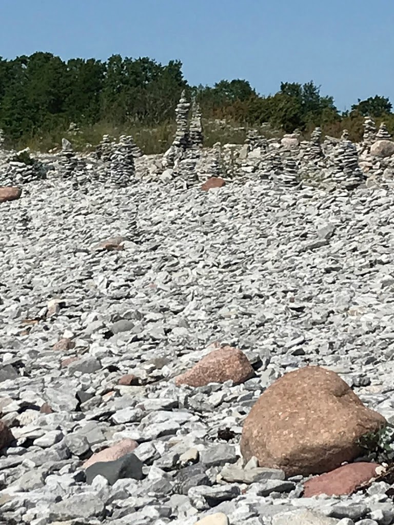 Turistai iš akmenų stato bokštelius. Vietovė vadinasi Ohessaare. Čia plentas eina pakrante. Akmenimis nuklotas visas krantas, tad bokštelių irgi daug.
