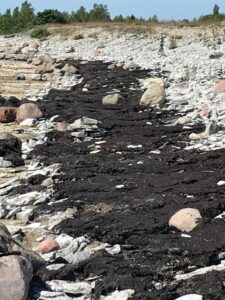 Pietvakarinė pakrantė nuklota plokščiais dolomitais, šlapiomis ir išdžiūvusiomis jūros žolėmis.