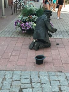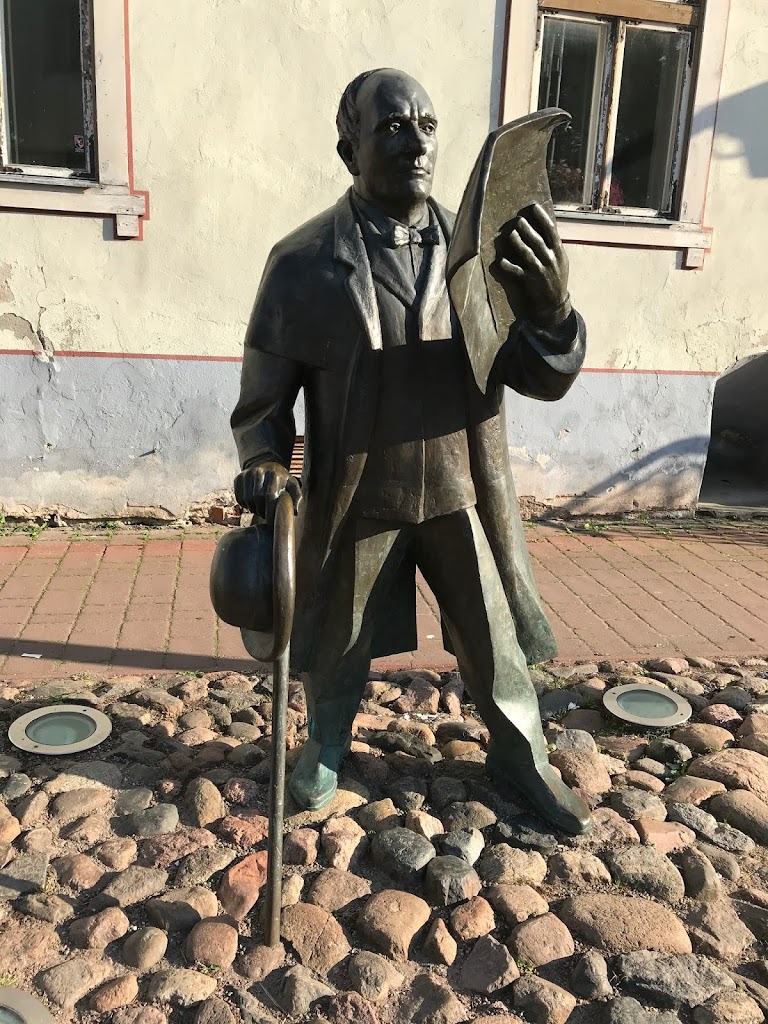 Tere- labas. Ir moku suskaičiuoti iki trijų estiškai. Dar žinau žodžius pilis, miestas, bažnyčia, švyturys estų kalba. Gyva skulptūra baigia pasiruošti dienos darbui ir turistų vilionėms. Jis šluoja pinigus, kai jam įdeda į katiliuką. Jei monetsas- ne.