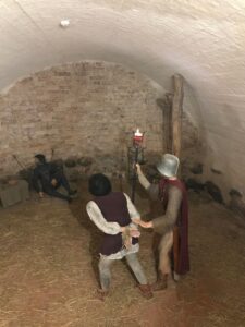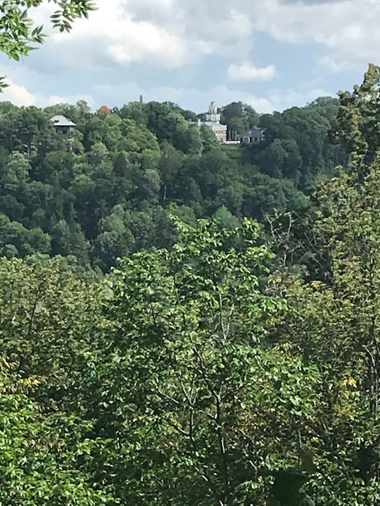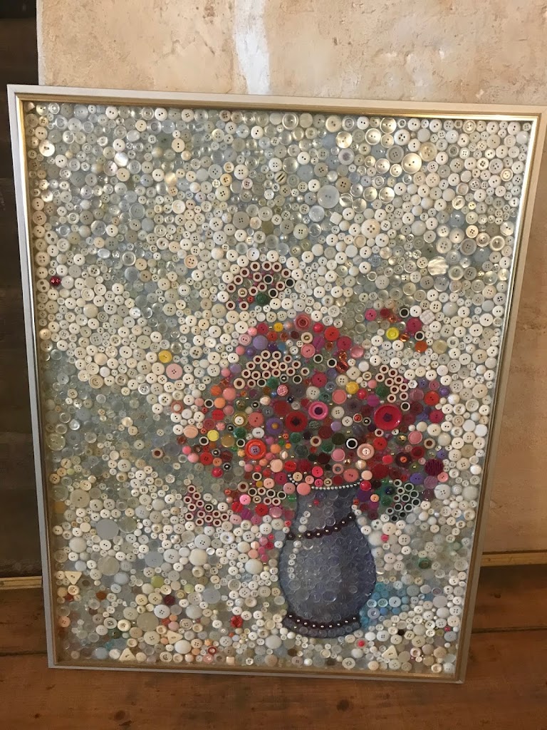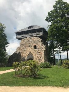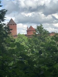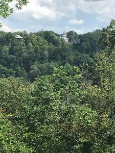 Lipant į bokštą yra paveikslų paroda. Įdomiausia tai, kad jie visi padaryti iš … sagų. Žiūrint iš bokšto,- visur žalia. Esame miesto centre, bet lyg parke.