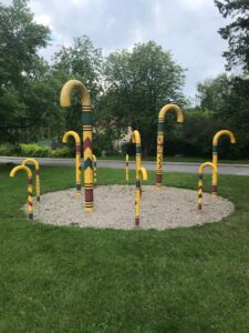 Pėsčiomis pro gėlių skverus, skulptūras. Apžiūrime Lazdų parką. Daug spalvotų lazdų vienoje vietoje stovi. Jos tapo Siguldos simboliu. XIX amžiaus gale, kai išsiplėtė turizmas Siguldoje, daug jų vaikščiojo su lazdomis.