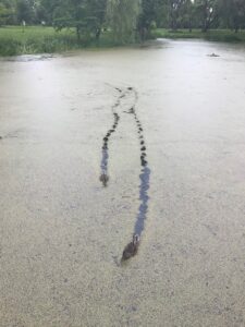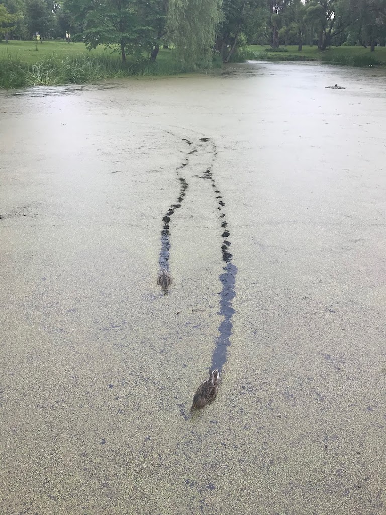 Toliau tvenkinys, vanduo stovintis pusiau pažaliavęs. Tokių pilna visoje Latvijoje. Antys plaukia per tirštą vandenį link turistų.