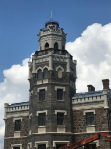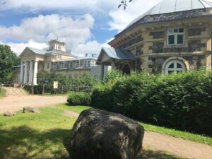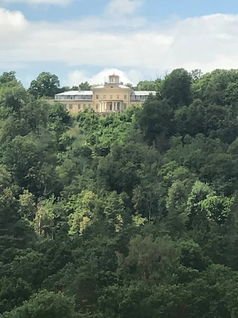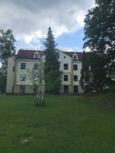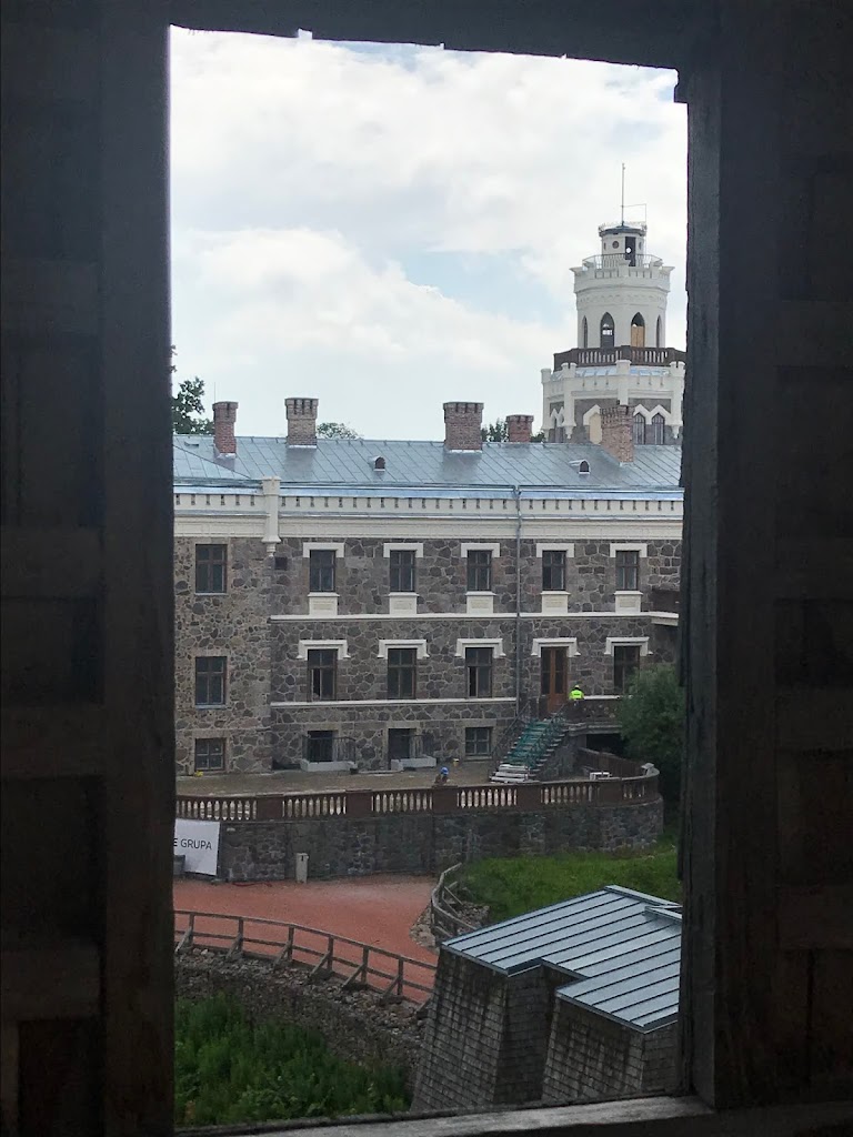 Atvykome į Krimuldos klasicizmo stiliaus dvarą. Kai kas atvyko lyno keliu ir vėl taip grįžta atgal. Mes einame visko pažiūrėti. Kunigaikščių Livenų rūmai pastatyti 1848 metais.