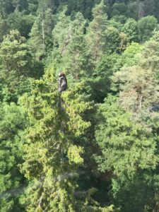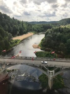 Ties Gauja aukštis virš vandens jau 42 metrai. Tikra Latvijos Šveicarija. Yra galimybė šokti iš vagonėlio su guma žemyn. Tiek to, gal kitą kartą. Meška sėdi ant eglės viršūnės. Bet mūsų ji nepasiekė.