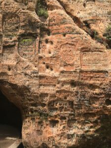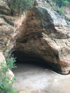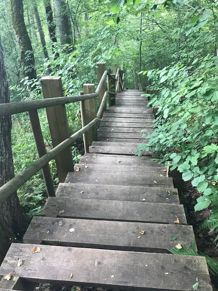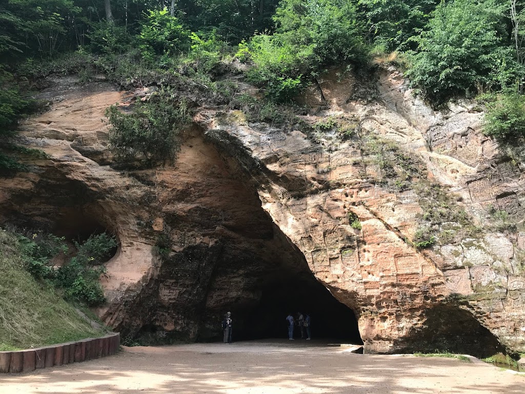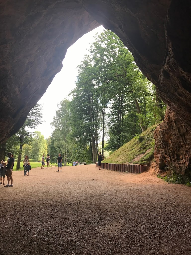 Taku einame tolyn. Medinis takas su turėklais virsta laiptais. Leidžiamės žemyn žaliame miške. Turistai lietuviai ir latviai. Mūsų tautiečiai vyrauja. Nulipame į Gaujos slėnį. Čia galima atvykti ir mašina.