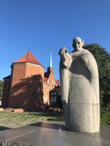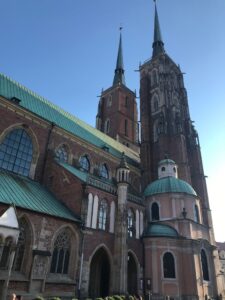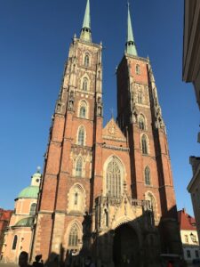 Katedra. Jos vietoje buvo pirma Vroclavo bažnyčia X amžiaus statybos. Gotikinė 2- bokštė šv. Jono Krikštytojo katedra. Per paskutinį karą sugriuvo daugiau nei pusė jos.
