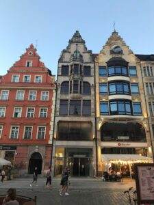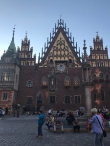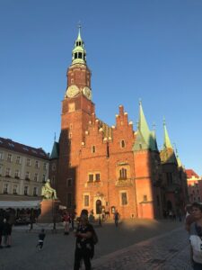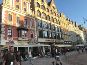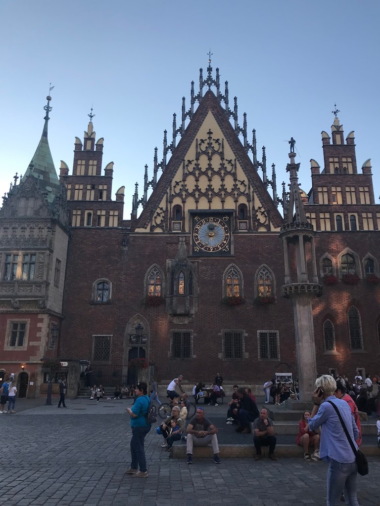 Kertame tramvajaus bėgius, einame kol pasiekiame Rynek aikštę. Ji viena didžiausių Lenkijoje ir Europoje. Daugelyje miestų dar prieš karą turgaus aikštėse vyko prekyba. Vroclave Rynek aikštė prekybai naudojama buvo iki XIX amžiaus.