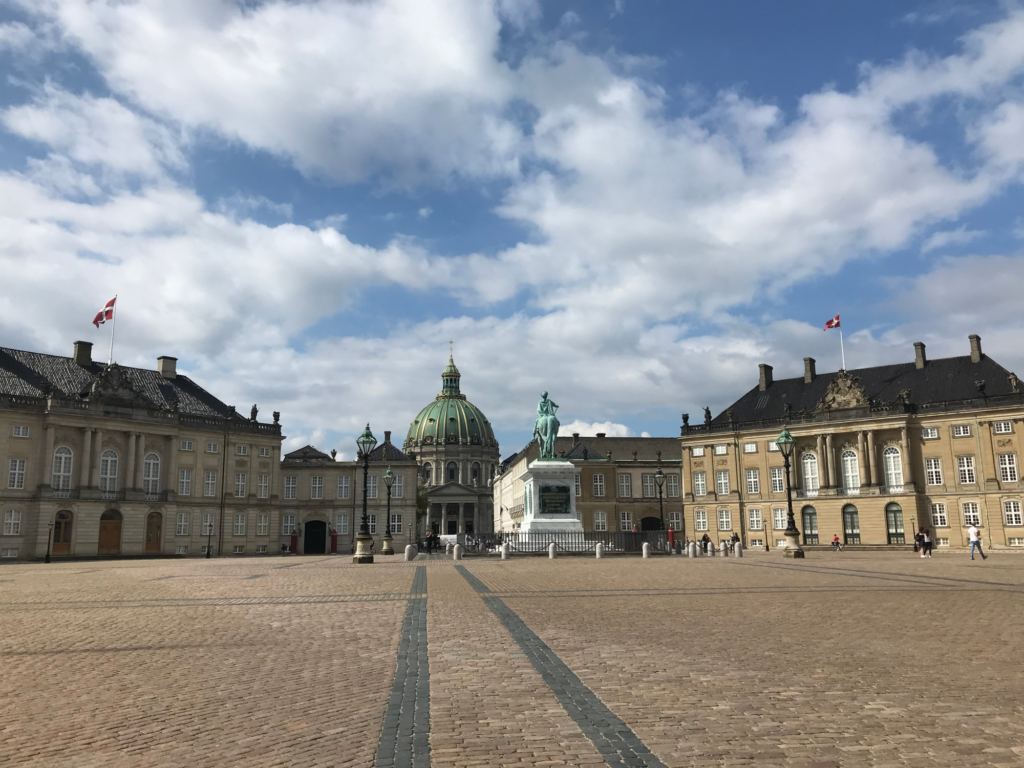 Amalienborgo rūmai netoli Kopenhagos centro. Pėsčiomis juos pasiekiau. Čia aštuonkampė aikštė, stovi ketveri rūmai. Stovi marmurinė bažnyčia, kurios kupolas gerai matosi. Prie jos yra metro sustojimas bažnyčios vardu. Rūmų teritorija gana atvira turistams. Vaikščiojau po ją, fotografavau sargybinius. Kol vienas sargybinis pasakė, jog į tą pusę neičiau, ten didesnė saugumo zona. Amalienborgo rūmuose gyvena Danijos karalienė Margarita II. Ji paveldėjo sostą po tėvo karaliaus mirties 1972 metais. Jos vyras prancūzas. Deja jis jau iškeliavęs anapilin. Margarita II yra antroji moteris karalienė Danijoje. Šios puikios šalies istorija sena ir turtinga. XIV amžiaus gale Daniją valdė karalienė Margarita I. 1389 metais ji su sukilusiais švedais nuvertė tuometinės Švedijos karalių. Be to ji buvo Norvegijos karaliaus Hokono VI našle. 1396 metais Margarita I pripažinta Danijos, Švedijos ir Norvegijos regente. 1397 metais Kalmare pasirašyta unija, jos sūnėnas Erikas Pamarėnas karūnuotas visų 3 karalysčių karaliumi.