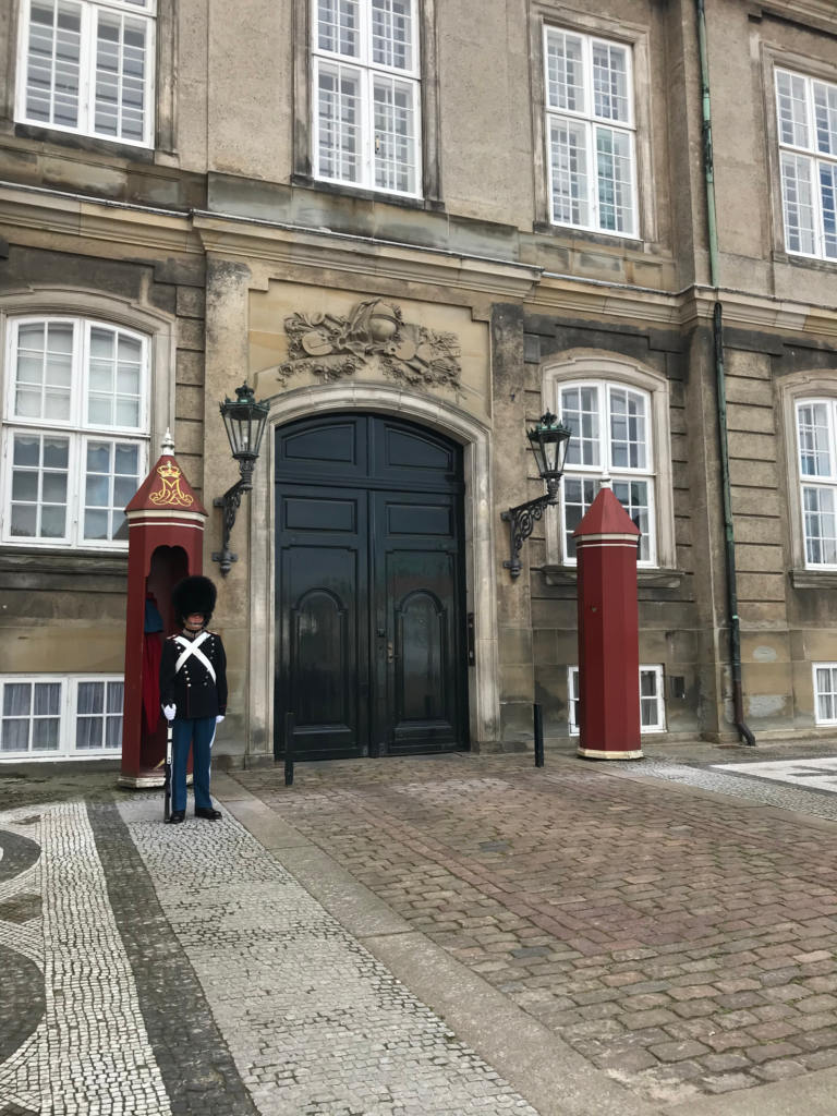 Karališka šeima Amalienborgo rūmuose gyvena nuo 1794 metų. Karališka gvardija saugo karališką šeimą. Danijos monarchija siekia X amžių,- seniausia Europoje. Konstitucinė monarchija- valstybinė Danijos valdymo forma. Karalienė formaliai dalyvauja įstatymų leidyboje ir valdyme. Pagal profesiją karalienė yra dailininkė. Ji yra piešusi bažnyčios interjero detales. Daug dėmesio skiriama menui. Danai tą jaučia- karalienę dailininkę. Dailininkas Vilmantas Marcinkevičius daug piešė Danijoje, kūrė Margaritai II portretus. Karaliene ji buvo priversta tapti 31 metų amžiaus, nes mirė jos tėvas karalius. Karališka gvardija yra nuo 1658 metų. Raudoni mundurai, meškos kailio kepurės ir rankinės sudėti patronams yra jų skiriamasis bruožas. Jai paprastai eina tarnauti savanoriai. Pamainos keičiasi kasdien 12 valandą. Groja gvardijos orkestras jei karalienė yra rūmuose. Jie ne tik stovi būdelėse, bet vaikšto aplink nustatytais maršrutais. Jie netgi trumpai pakalba su turistai arba sostinės gyventojais. Karališkos gvardijos būstinė yra Rozenborgo pilyje.