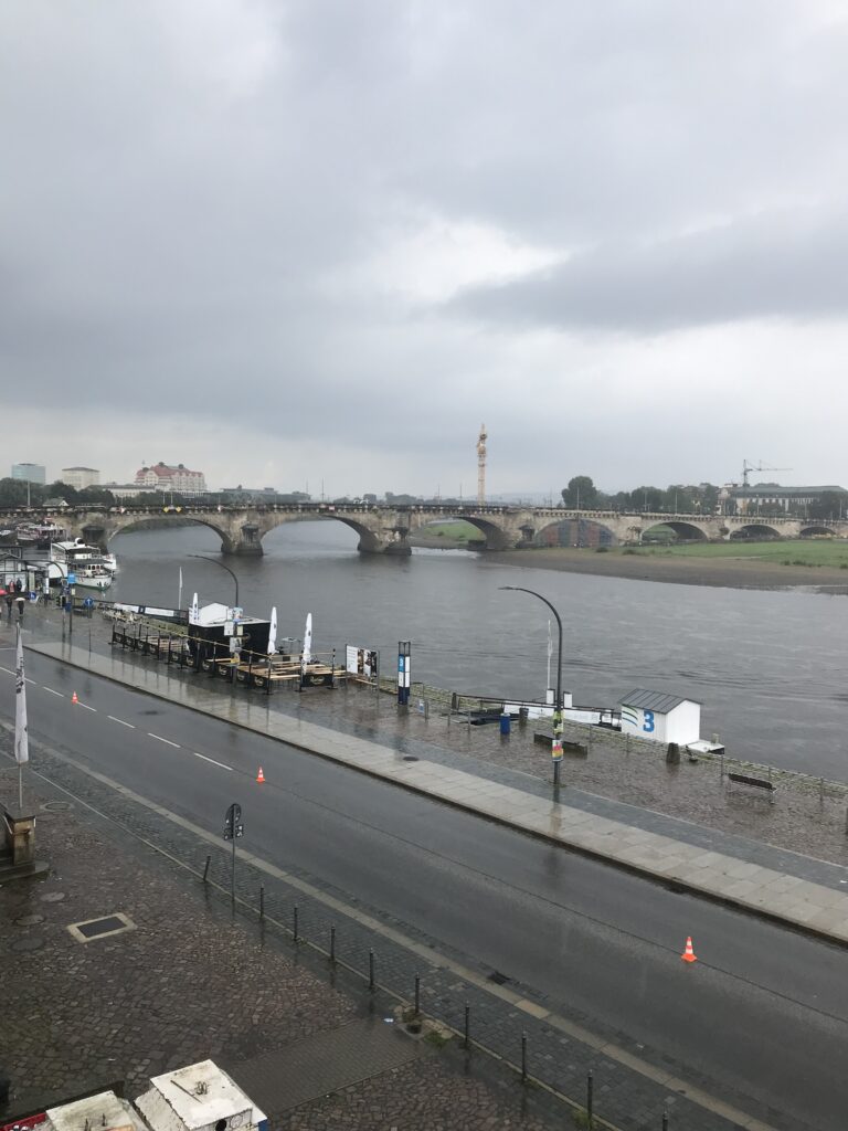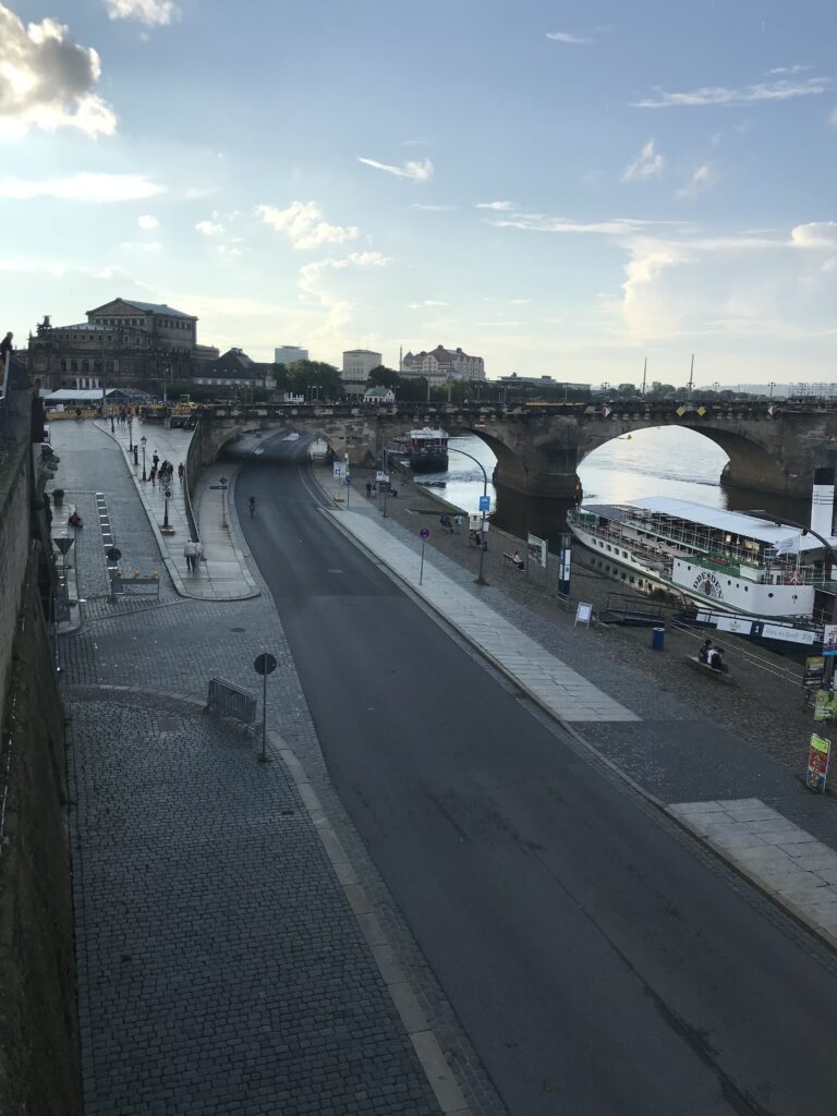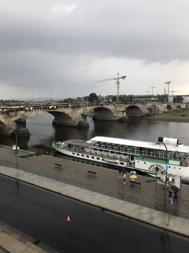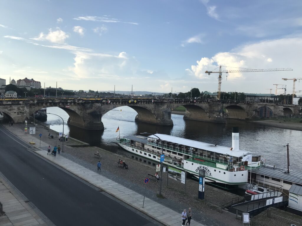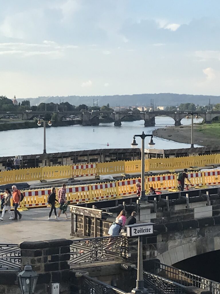 Einu tiltu per Elbę į dešinį krantą. Tikslas pamatyti Canaleto vaizdą iš kitapus. Vaizdas ne per geriausias. Daug statybinių kranų užstoja gražų vaizdą. Jų apie dešimt. Net ant tilto stovi kranai. Keista, nes nuo 1945 metų jau kiek prabėgo laiko?
