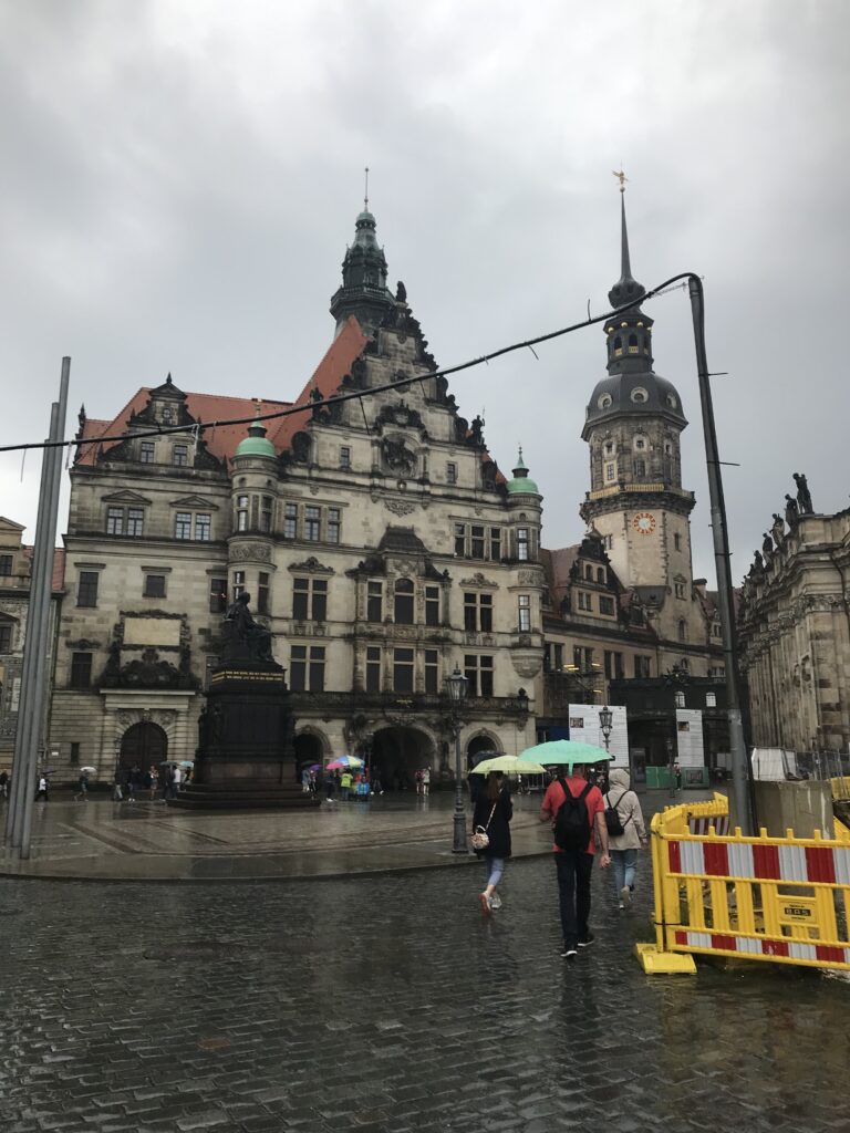 Be to ima lyti. Ne paprastai, bet liūtis. Skėtį turiu, bet peršlampu kiaurai. Nuo kaklo iki pėdų. Nekoks sprendimas buvo eiti į atvirą vietą, kur nėra pastogės. Bet pirmą kartą Drezdene, kitą kartą žinosiu. Net piniginė peršlapo su pinigais, grįžtant Lenkijoje nepriėmė mano šlapių zlotų. Čia nufotografuoju po liūties auksu blizgantį paminklą Augustui II.