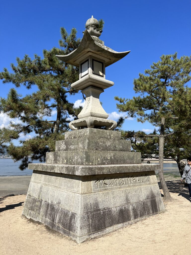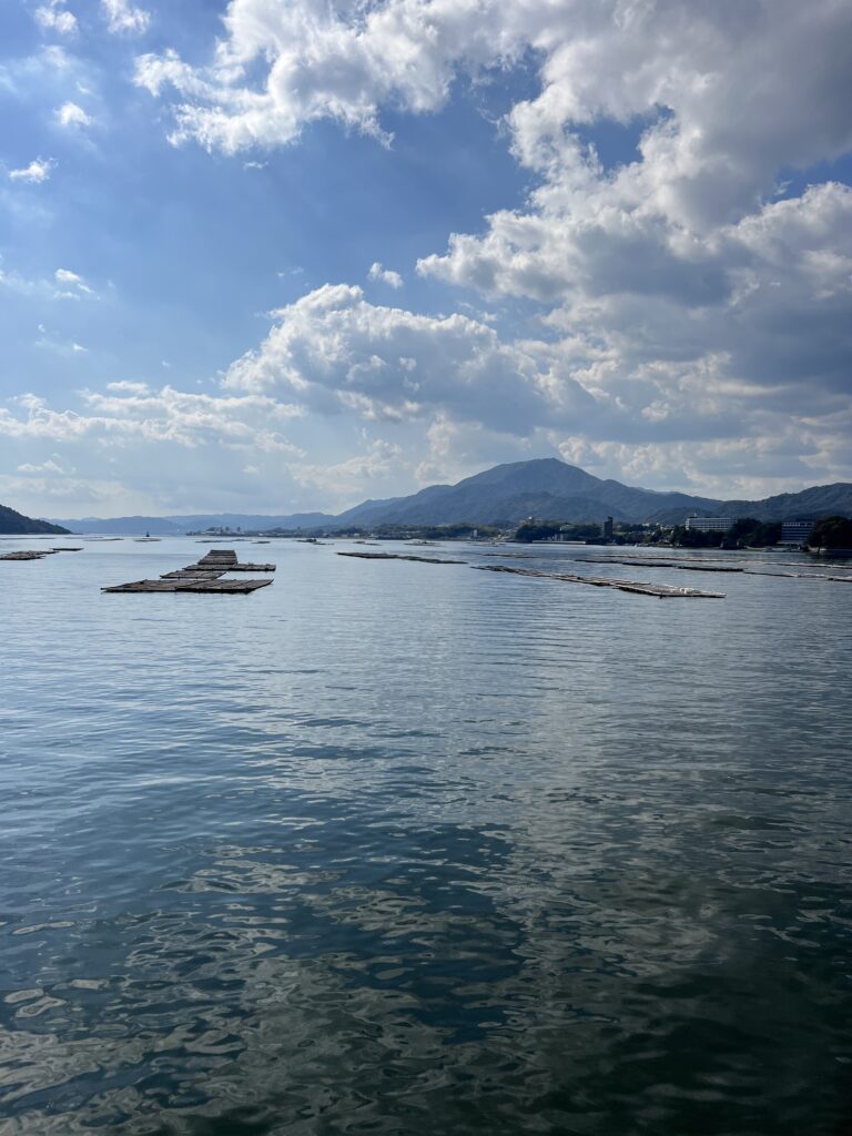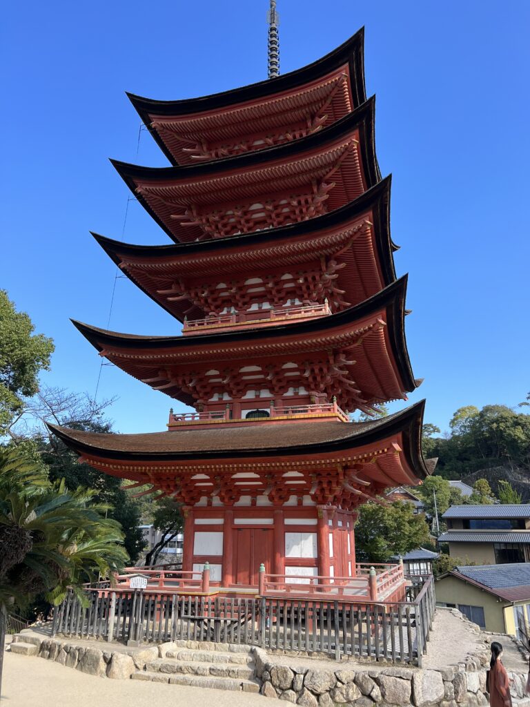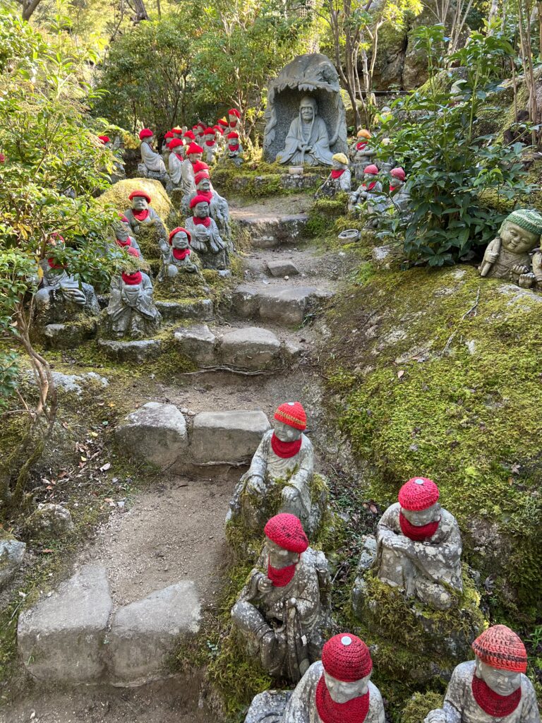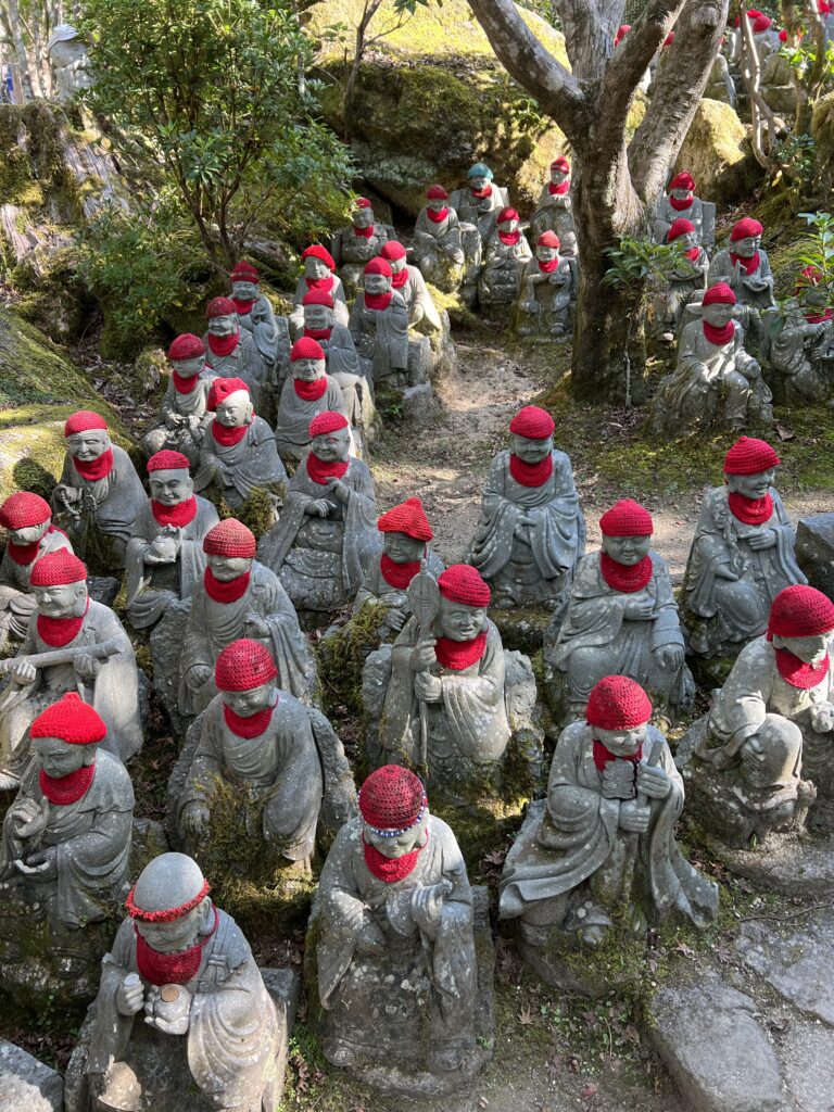 Netoliese šintoistinė šventykla. Ją apeiname, apžiūrime. Už jos kelias į kalną. Ten dar budistinė Daishoin šventykla su vaizdu žemyn. Tiltas per upę. Tvenkinukas su vandens lelijomis. Pakeliui pavalgome keptų austrių. Europoje austrės yra prabangos maistas, o Japonijoje turistų pakelėje. Jos šalia jūros sąsiauryje auga. Pakeliui į kalną daug akmeninių žmogučių palei kelią raudonomis kepurėmis. Jie saugo vaikų sveikatą. Viršuje yra gongas, kurį galima skambtelti.