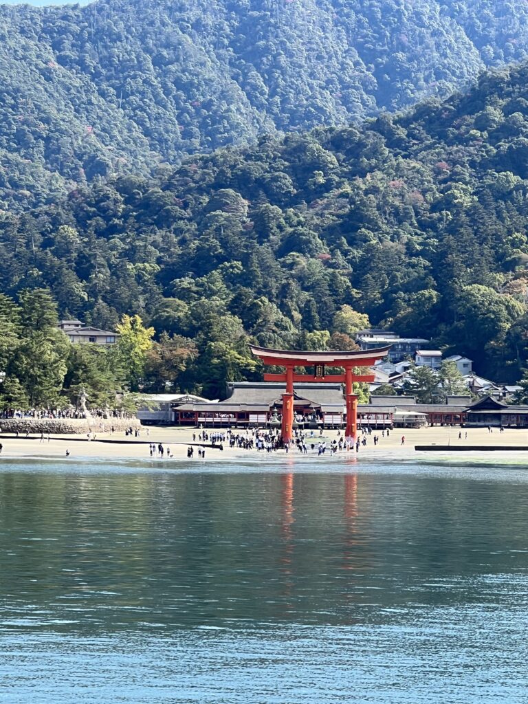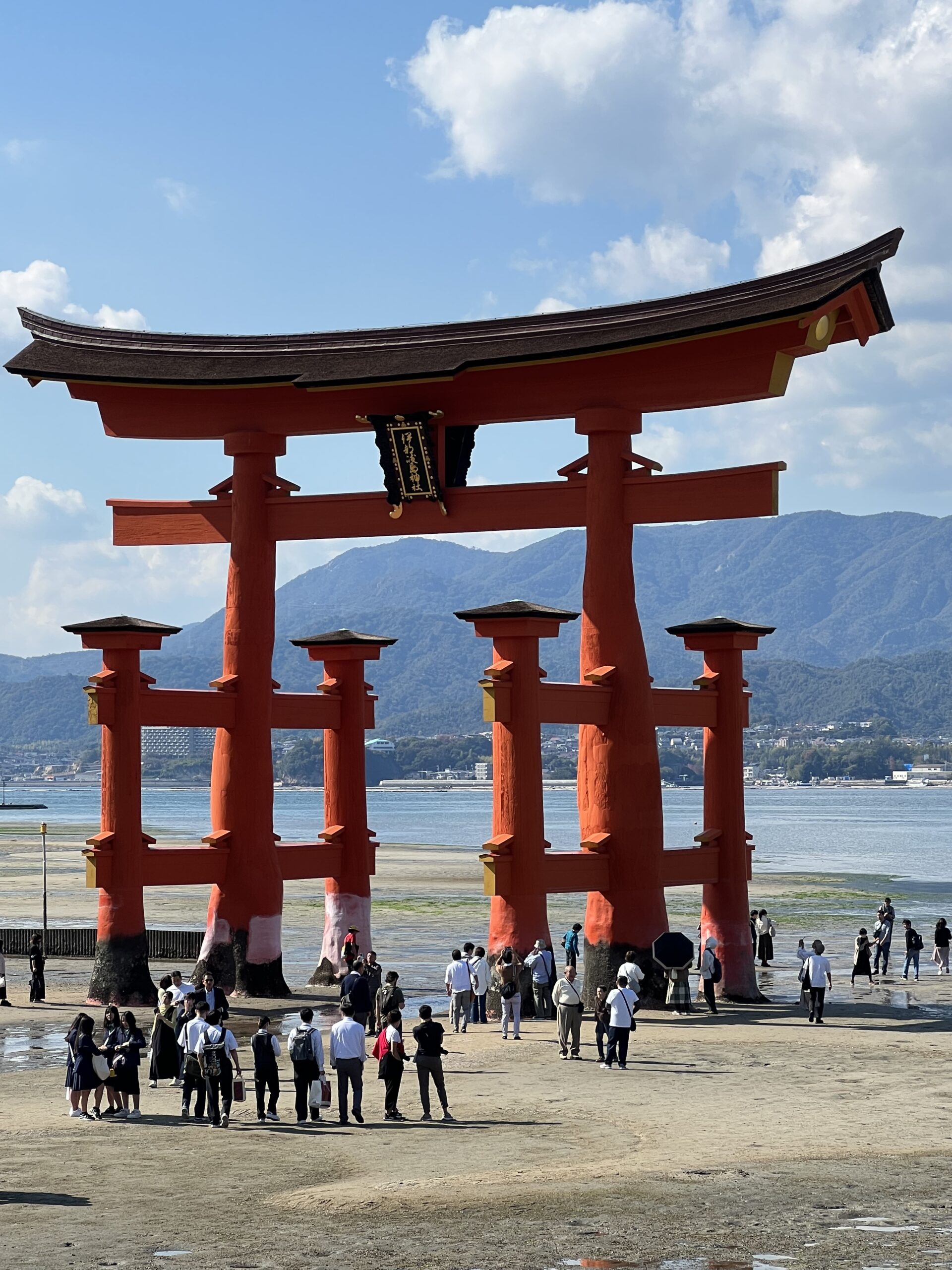Mijadžimoje išlipome po neilgo plaukimo. Pasitinka elniai, kurie saloje gyvena. Norisi juos glostyti, šerti ir fotografuotis, bet nėra laiko. Einame prie raudonųjų vartų. Vaizdas tikrovėje pranoko įsivaizduotą. Fotografuojamės. Einame apie vartus ir per juos. Nes… atoslūgis, jūra atsitraukusi. Juos galima liesti, fotografuoti.