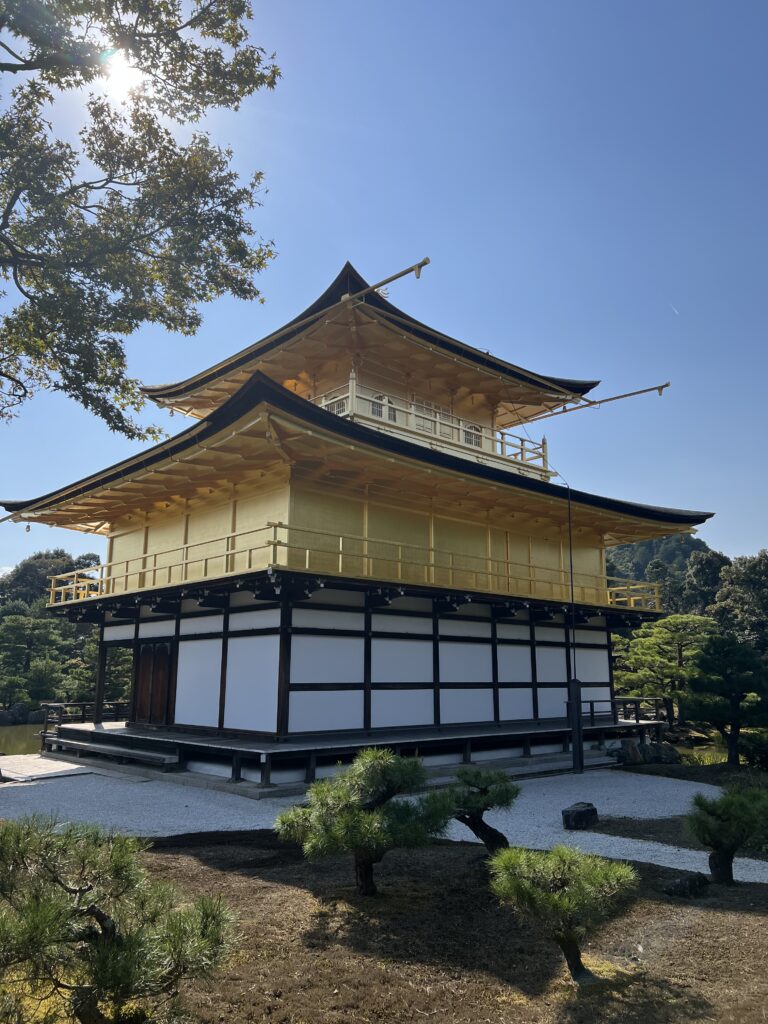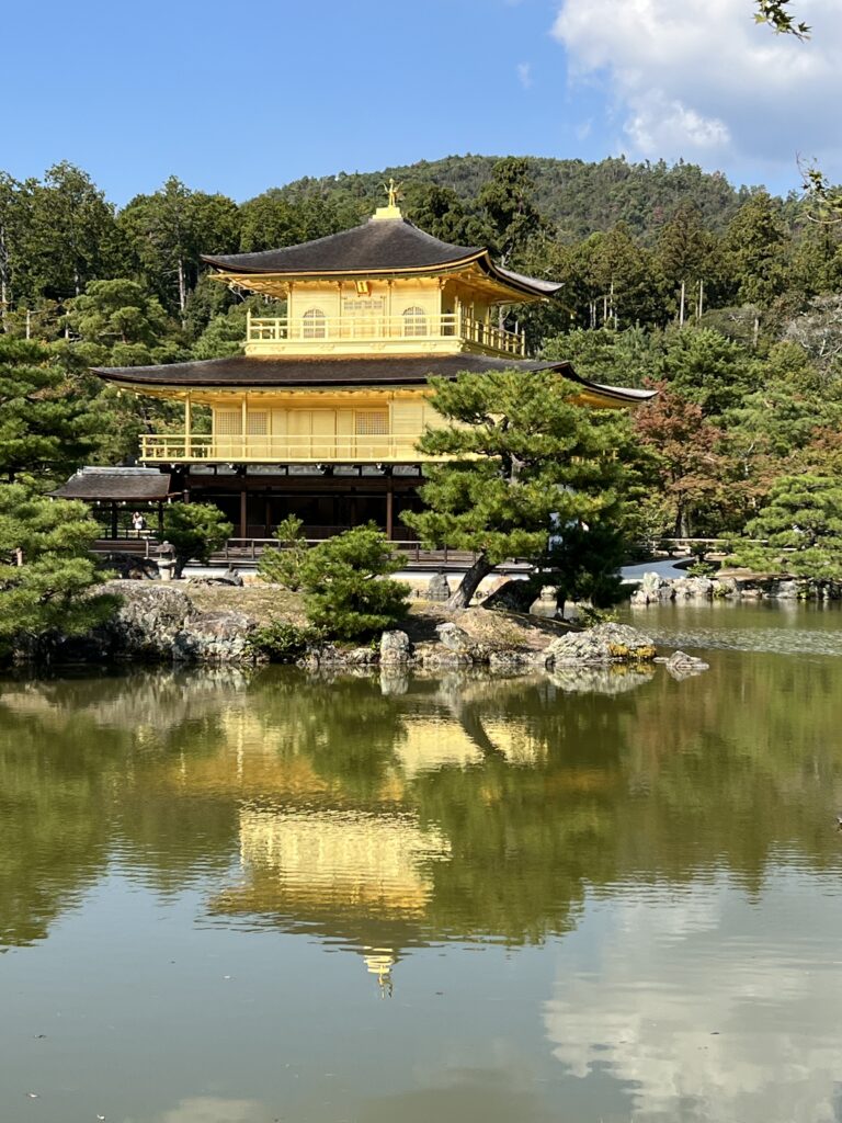 Auksinis paviljonas saugomas UNESCO. Čia Kinkakuji šventykla labai fotogeniška. Atspindžiai vandenyje. Masė turistų fotografuojasi Auksinio paviljono fone. Čia apžiūrime iš išorės, po to takas kyla aukštyn. Yra vieta turistams mesti monetas ir pataikyti į indelį. Dar yra labai sena pušis. Neaukšta, įstrižai auganti. Lyg milžiniškas lapas.