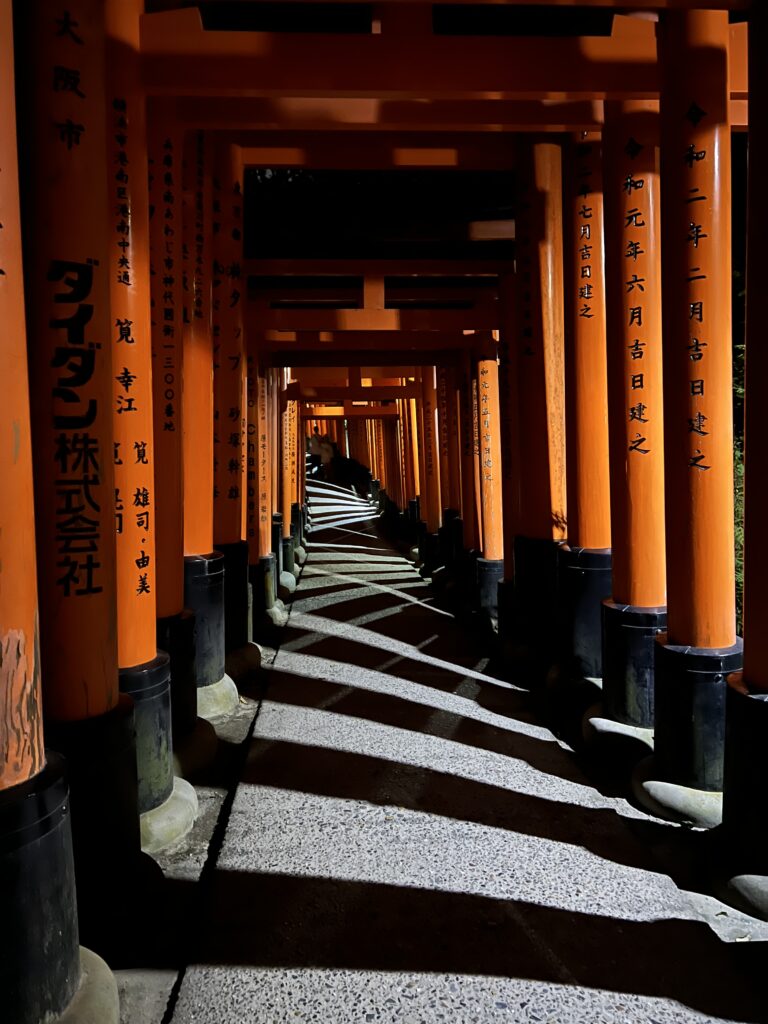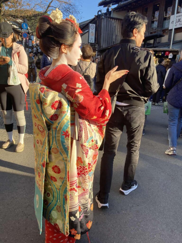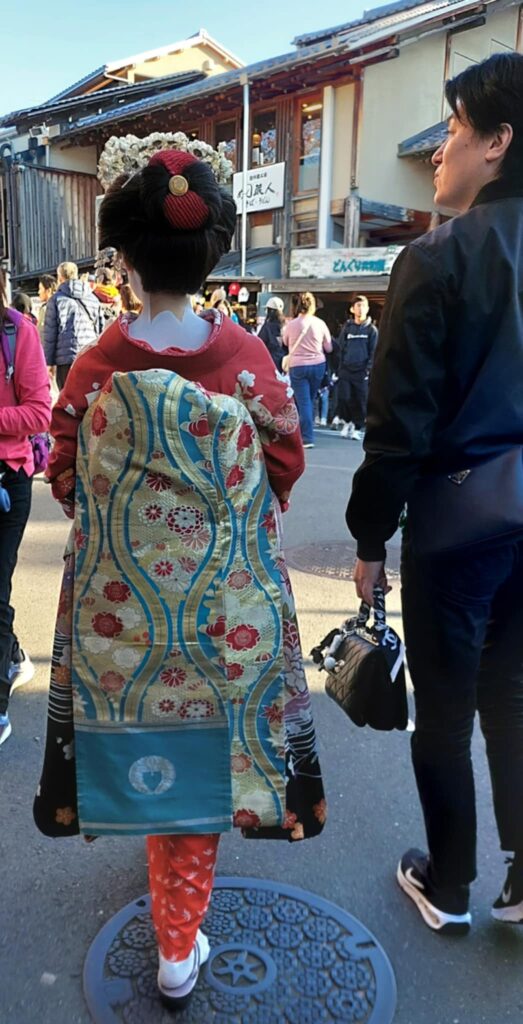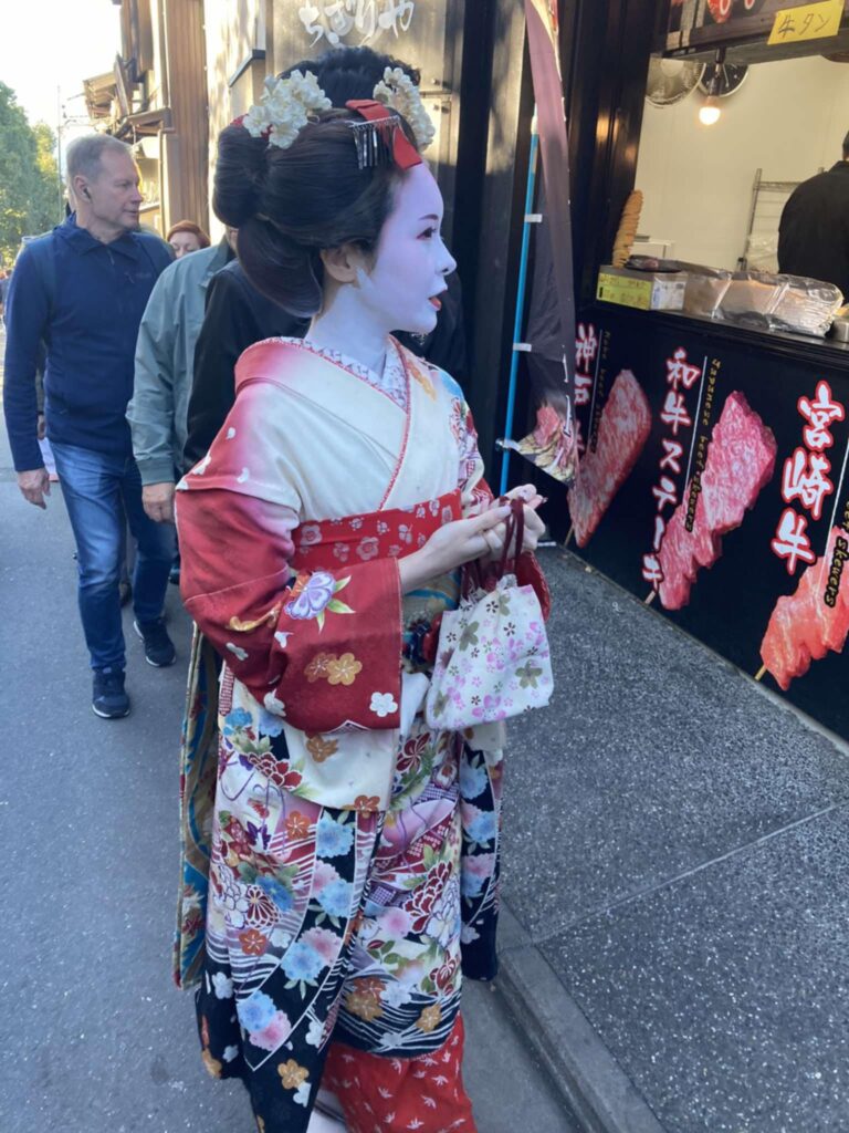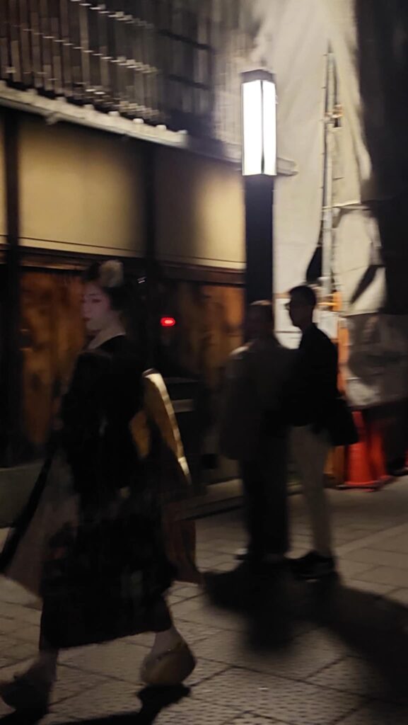 Kiote vakare pažiūrime spektaklį apie vietines tradicijas, apie Kioto gyvenimą. Mieste einame ieškoti geišų. Kiote jos vadinamos geiko. Jos tamsiais drabužiais, pamatyti ir nufotografuoti sunku. Pavyksta tamsoje užfiksuoti.