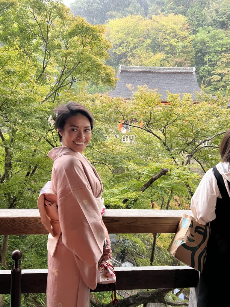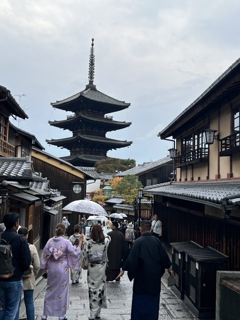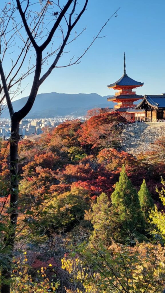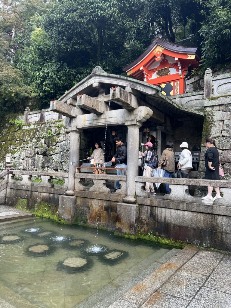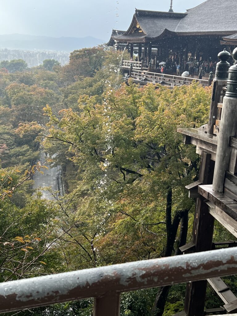 Kijomizu šventykla pasirodė visu gražumu. Kaupėsi juodi debesys. Bet buvo šilta. Pradėjo lyti. Tam buvome pasiruošę. Bet lietus sustiprėjo iki krušos. Labai stipri. Buvome šventyklos pastogėje. Lauke sniego prisnigo, kad tapo slidu. Čia vaizdas atsiveria paėjus į šoną, nusileidus taku žemyn. Ten švento vandens šaltinis. Samčiai ilgais kotais, bet atsigeriame, nusiprausiame. Žmonių nedaug dėl krušos. Po to einame siauromis senamiesčio gatvelėmis. Jos stačios, vingiuotos ir siauros. Daug vietų nusifotografuoti. Naminiai marinuoti agurkai užkandai. Kijomizu šventykla nuostabi.