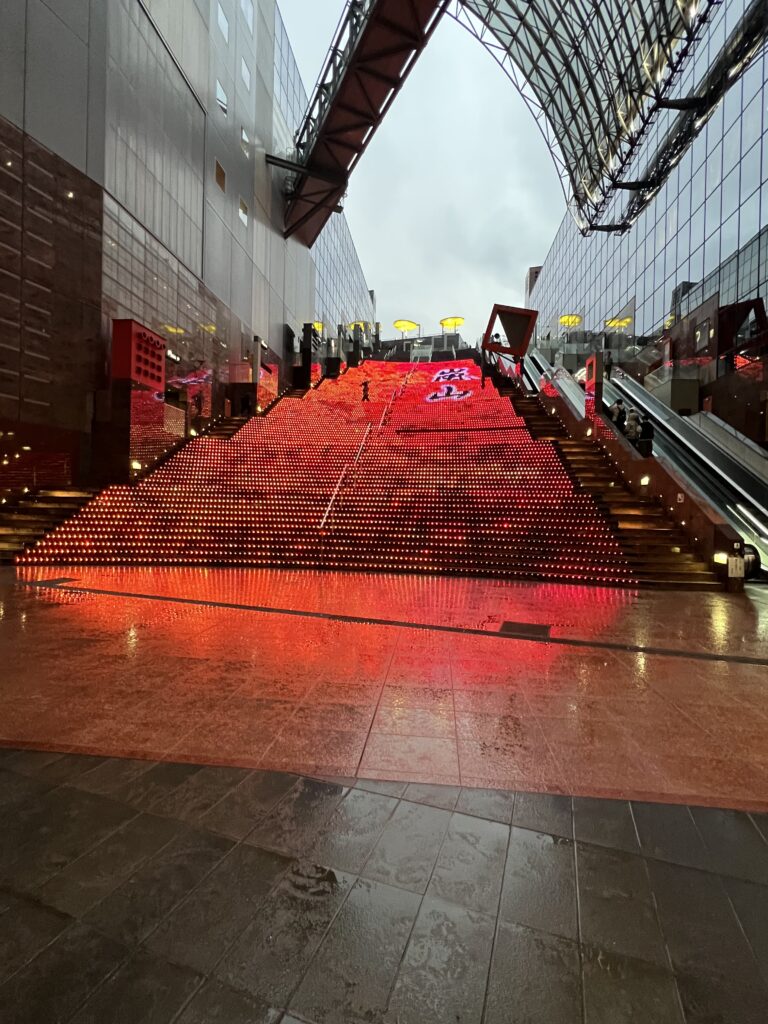 Tokiu greičiu atskrendi į Kiotą. Tai senoji Japonijos sostinė. Ji išliko per paskutinį karą nesugriauta. Daug turistų. Miestas didelis. Tačiau nustebino geležinkelio stotis,- supermoderni, daug aukštų, daug erdvės viduje ir išorėje. Tai tiesiog milžiniškas meno kūrinys. Apsigyvenam centre. Viešbutis susietas su TV bokštu. Iš bokšto vaizdai tamsoje nuostabūs, visas miestas po kojomis.