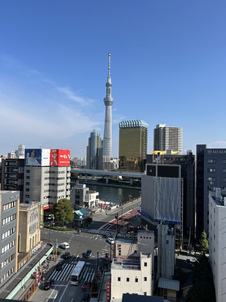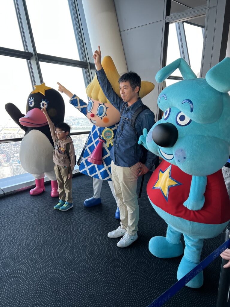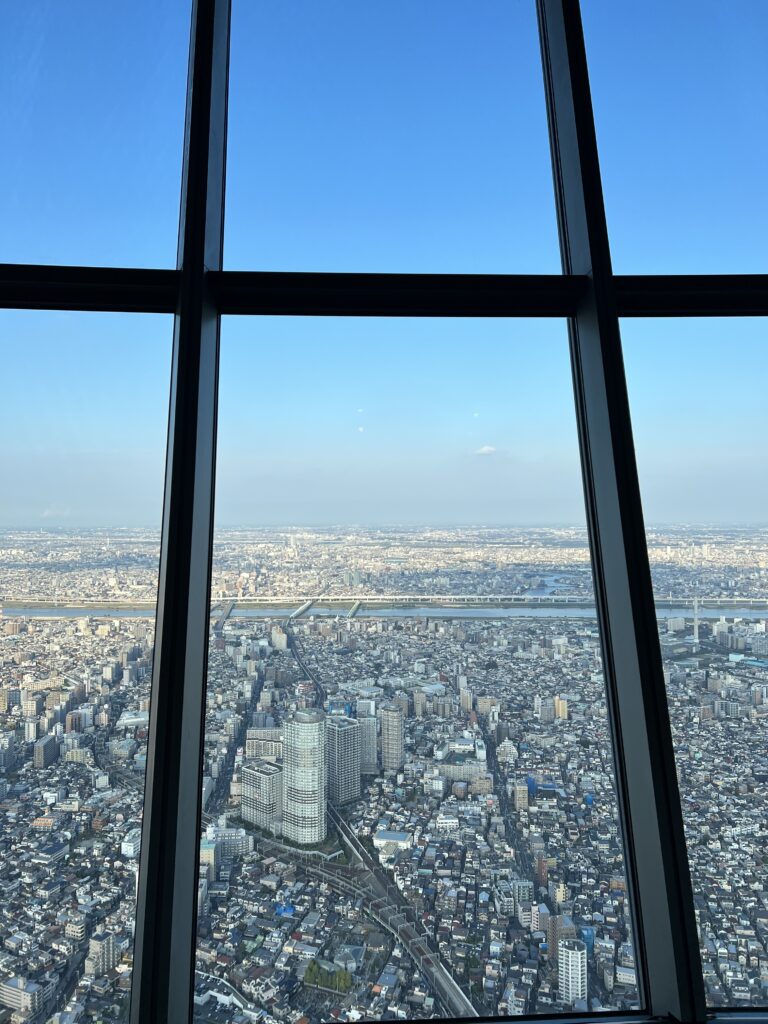 Tokijo Skytree (Tokijo televizijos ir apžvalgos bokštas) yra 634 metrų aukščio. Baigtas statyti 2012 metais. Priešais bokštą stovi gelsvo bokalo su balta puta statinys. Tai Asahi alaus daryklos ofisas. Skytree masinis turistų traukos centras. 350 metrų aukštyje didelė Tokijo dalis matosi, net vandenyno dalis. Tačiau dalį jo dengia rūkas, netgi garsųjį Fuji kalną.
