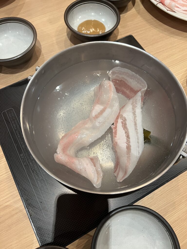 Netoliese einame į restoraną didelio pastato antrame aukšte. Valgome šabu- šabu. Pavadinimas keistas. Bet maistas neįprastai pateikiamas, bet labai skanus ir geras. Sėdime prie stalo keturiems. Viduryje stalo puodas su vandeniu. Uždega dujas padavėjas, vanduo užverda. Atneša labai plonai pjaustytos jautienos ir kiaulienos. Dedame mėsą į puodą, ji tuoj išverda, susitraukia. Valgyti labai skanu, ypač kiaulieną. Prieskonių, padažų būna pridėta daug. Gėrimai netoliese. Didelis aparatas. Visi gazuoti gėrimai ir pepsi kola ir koka kola. Tik aparatu sunku pasinaudoti nepratus.