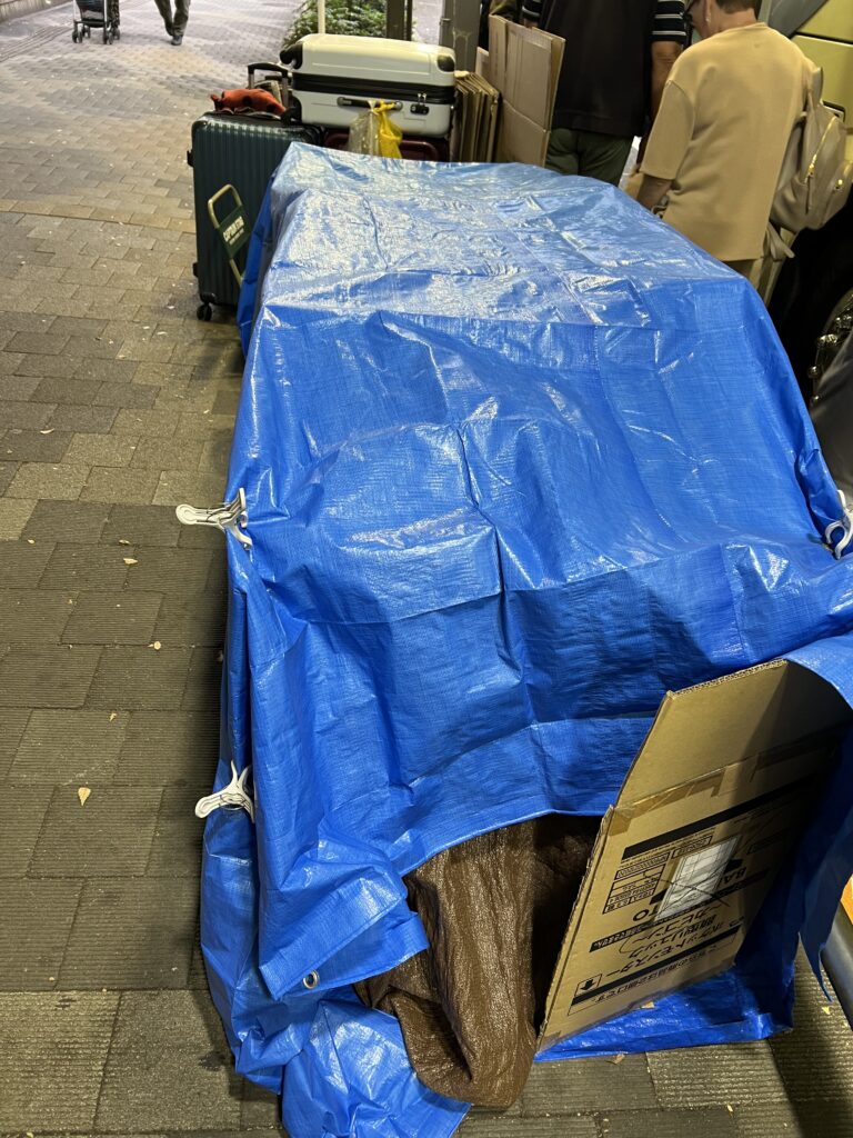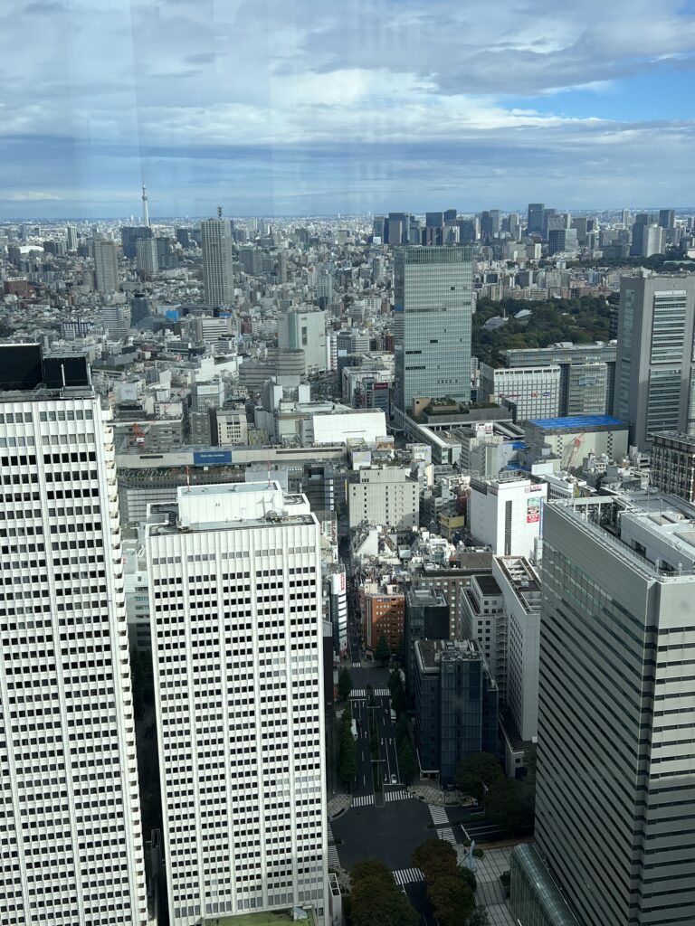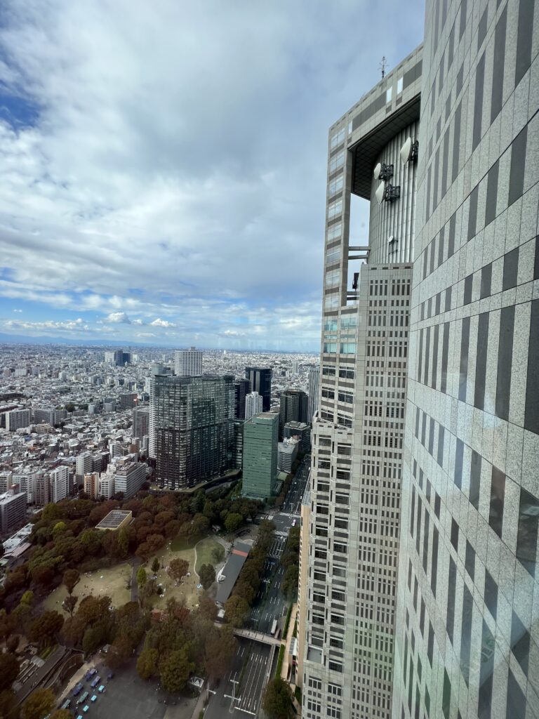 Nelabai toli nuo čia Tokijo metropolijos vyriausybės pastatas. Nuo 45 aukšto,- namo stogo puikūs vaizdai į sostinę. Žemiau negu televizijos bokštas. Ryškiau matosi apačioje miestas. Prie pastato yra daug erdvės po stogu. Joje įsikūrę benamiai. Bet tvarkingai, gražiai, dėžės supakuotos , daug lagaminų irgi.